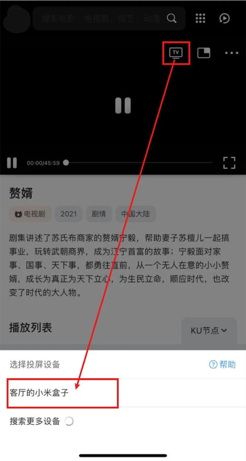 打开夸克浏览器->打开2025国产高清免费不卡影视资源合集|免费在线观看每日更新->播放视频->选择·····右上角 … ->投屏->等待搜寻出智能电视/电视盒子->选中,即可投屏。
