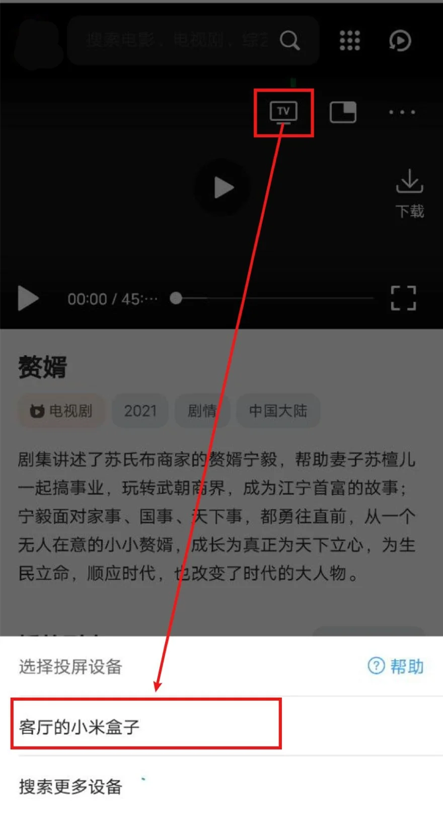 打开QQ浏览器(会接管网页播放器)->打开2025国产高清免费不卡影视资源合集|免费在线观看每日更新->播放视频->选中投屏图标->等待搜寻出智能电视/电视盒子->选中,即可投屏。